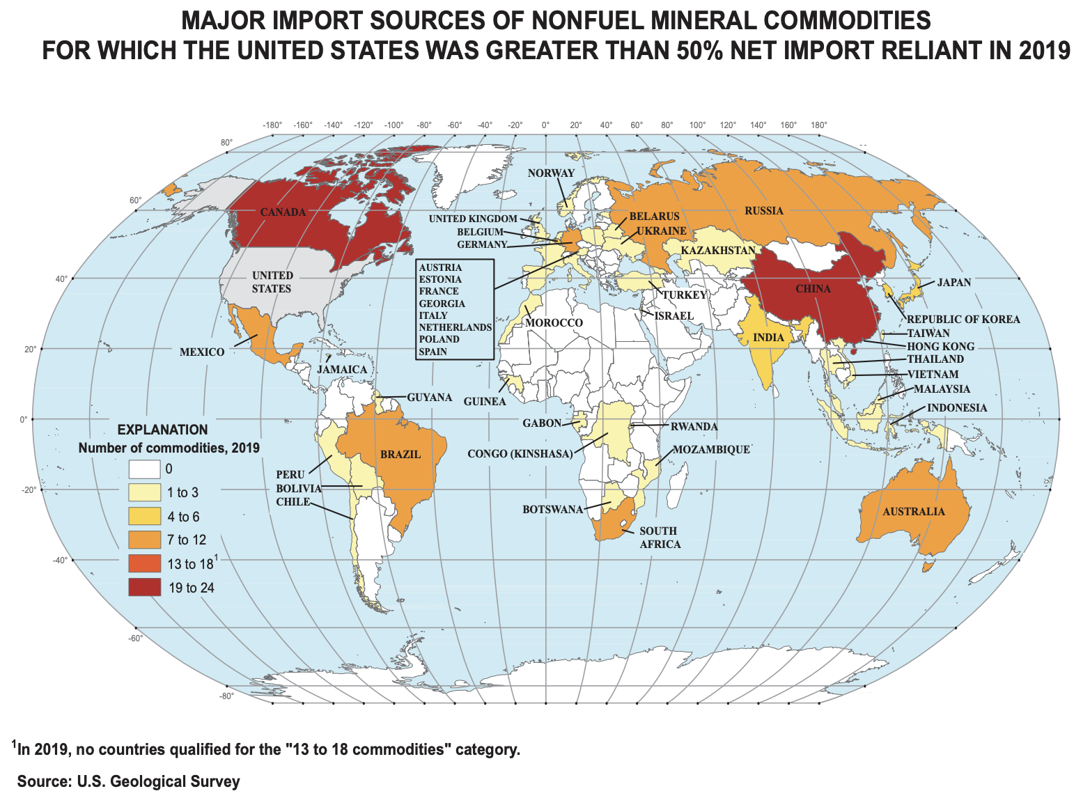 According to the report, the United States is 100% reliant on imports for 17 minerals and more than 50% import-reliant for another 29. With growing demands for minerals, lawmakers are once again looking for ways to reduce this reliance on foreign nations for minerals critical to national defense, transportation, health care, energy and technology.