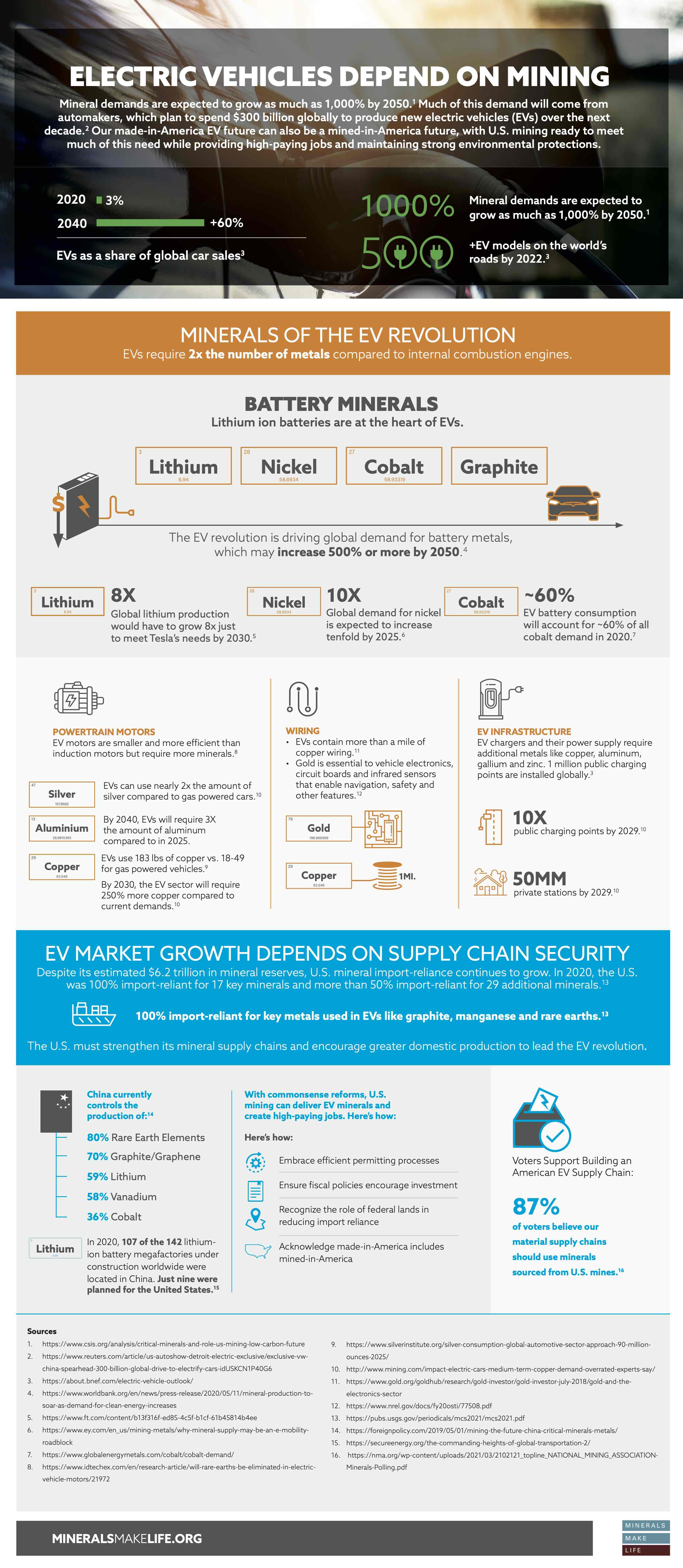 The U.S. can lead the world in electric vehicle (EV) production and technology but to do so we must reshore critical industries and develop of a world-class mineral supply chain. By supporting American mining of metals like copper, silver, lithium and nickel and investing in the domestic plants that make batteries for EVs, the U.S. can meet global demands for EV manufacturing and infrastructure. Learn why we must strengthen our mineral supply chains to lead the EV revolution.