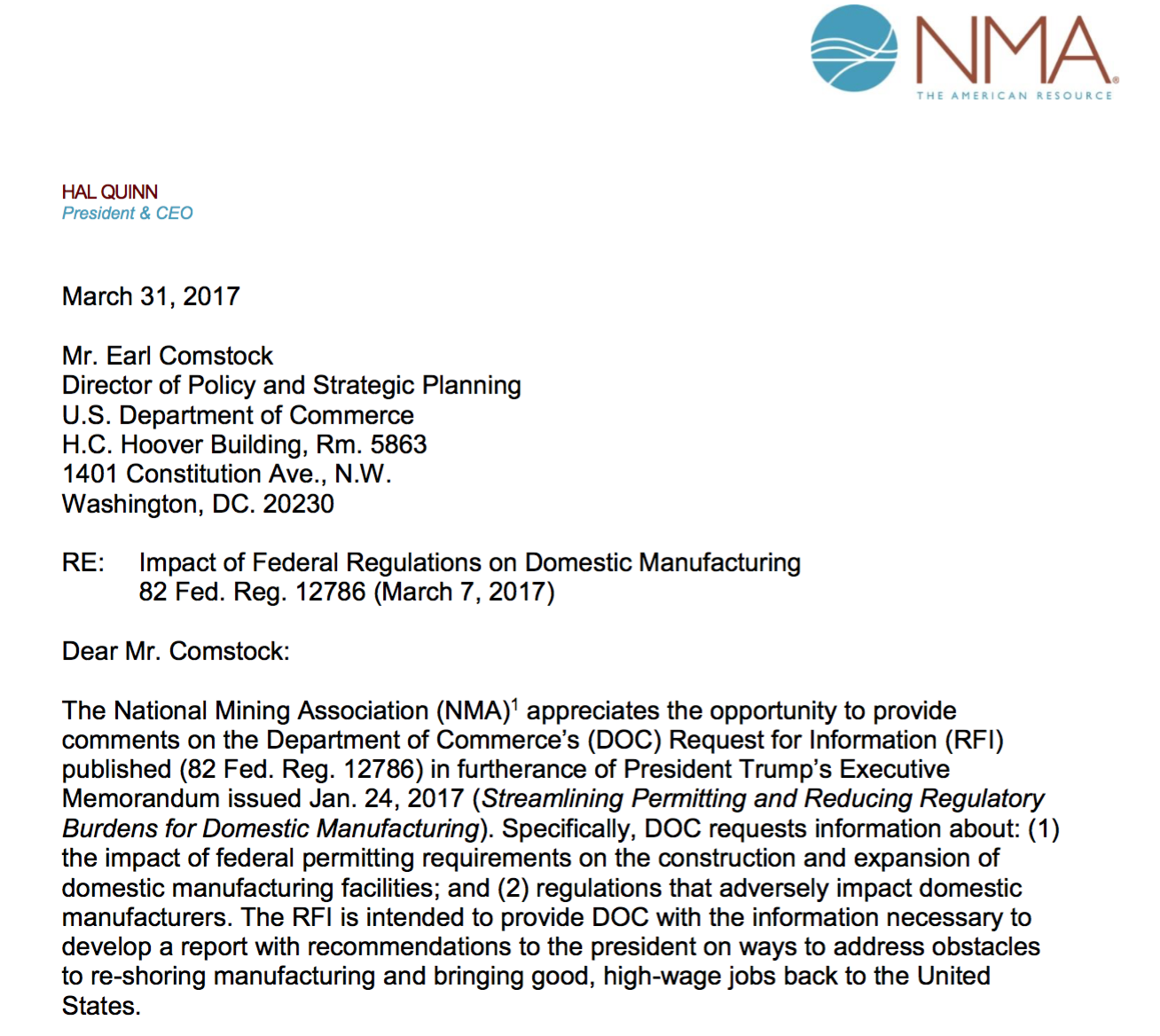 Resources Testimony NMA’s Comments to the Department of Commerce: Impact of Federal Regulations on Domestic Manufacturing
