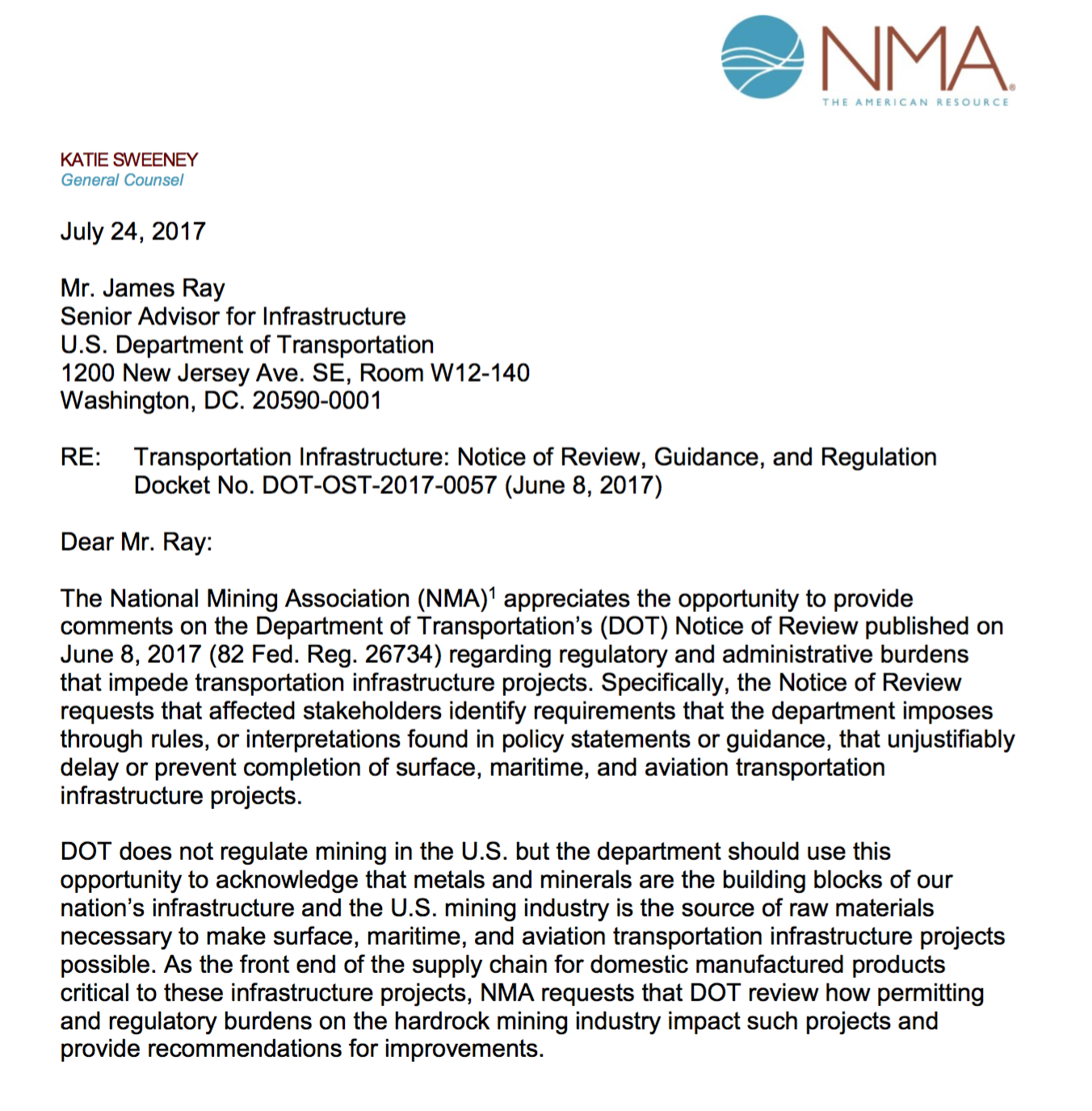 NMA’s Comments to the Department of Transportation: Regulatory Burdens Impeding Transportation Infrastructure Projects