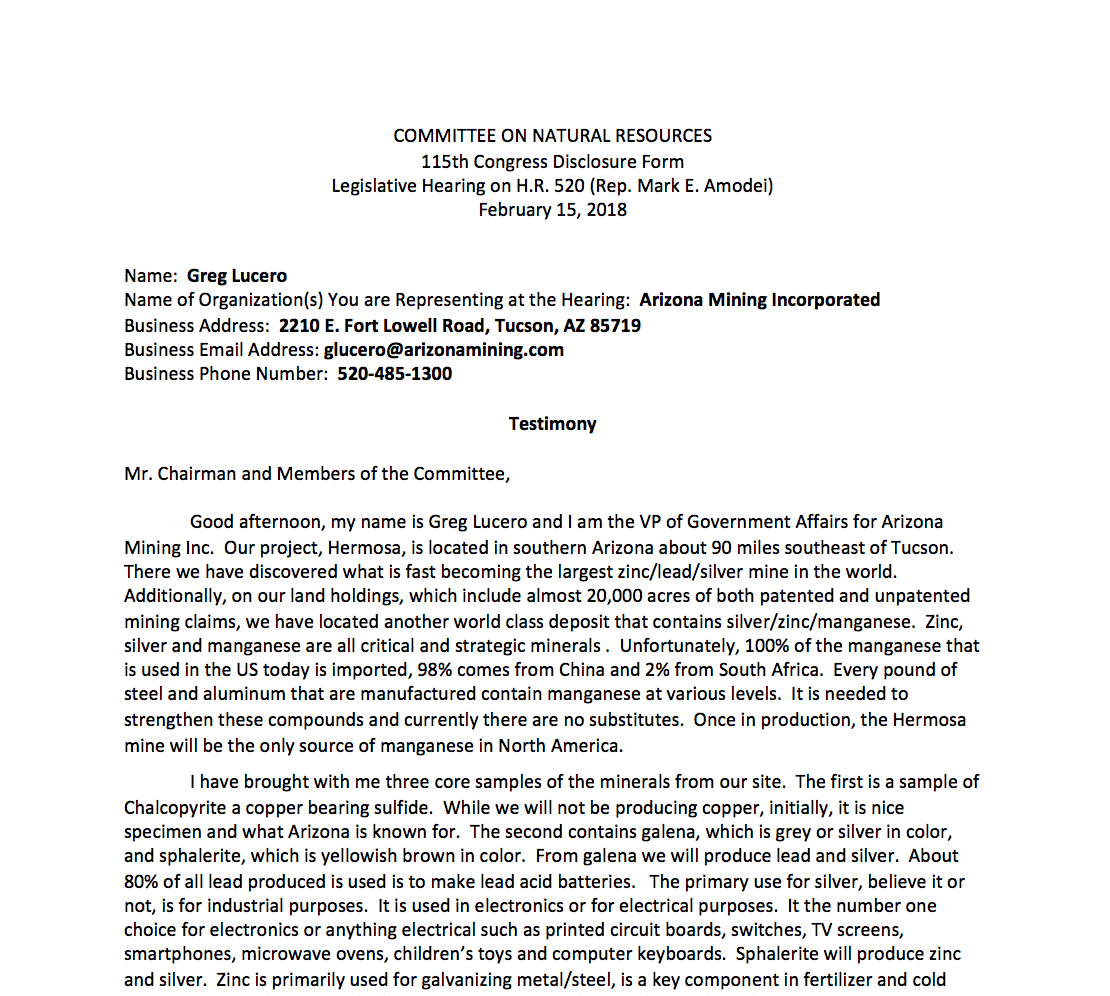 Resources Testimony Testimony of Greg Lucero of Arizona Mining Incorporated