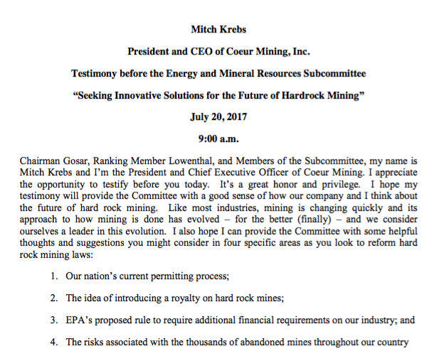 Resources Testimony Testimony of Mitch Krebs, President and CEO of Coeur Mining, Inc., Testimony on Hard Rock Mining