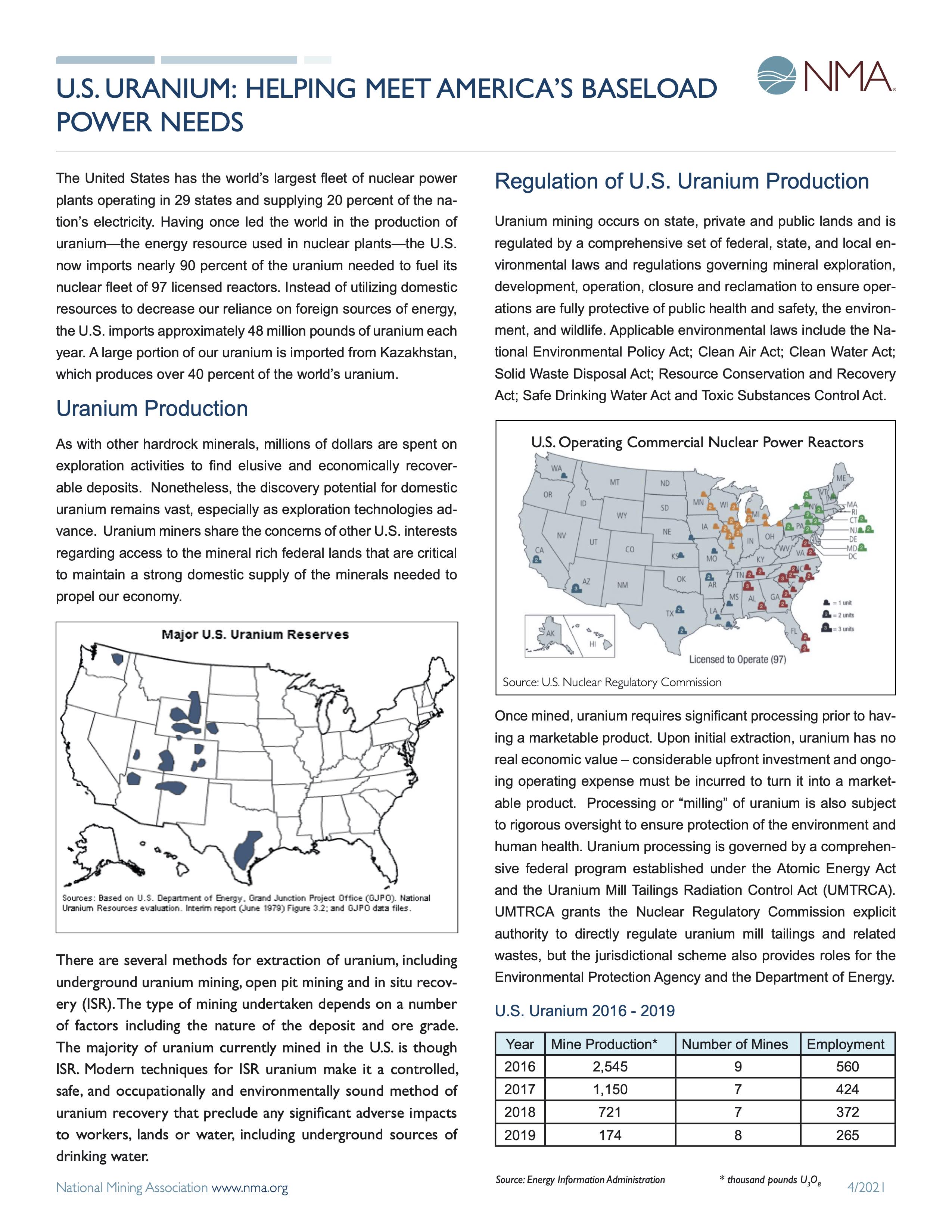 Resources Fact Sheets U.S. Uranium: Helping Meet America’s Baseload Power Needs