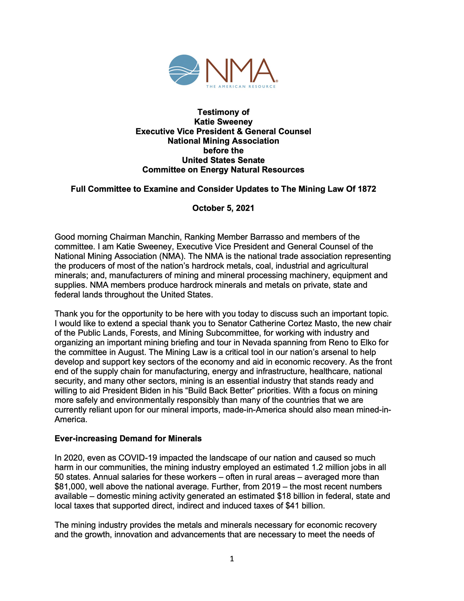 Resources Testimony United States Senate Committee on Energy Natural Resources: Full Committee to Examine and Consider Updates to The Mining Law Of 1872